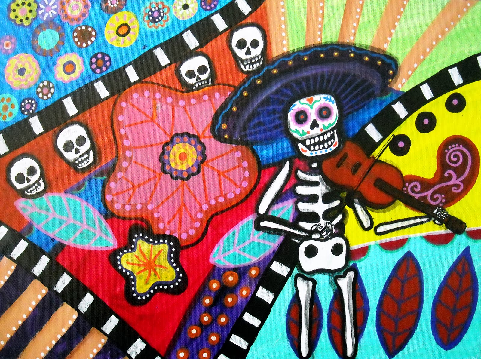 This painting is titled "El Serenata" meaning Serenade. This Day of the Dead Art was painted on 12x16 inches stretched canvas. Check out art at PRISARTS GALLERY
